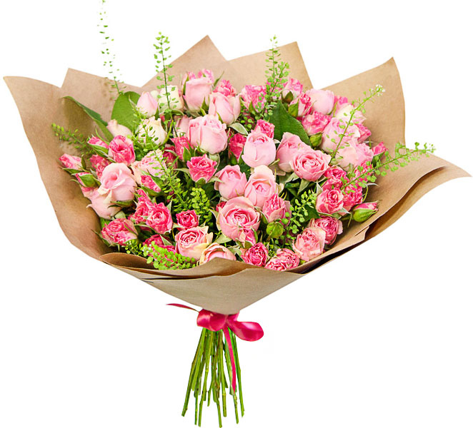 Чудесный букет из прекрасных розовых кустовых роз - это букет символизирующий элегантность и романтичность, восхищение и нежность, радость и нежную искреннюю любовь. Порадуйте любимых этим замечательным букетов благоухающих роз.
